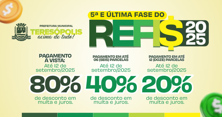 Lançado em abril pela Secretaria de Finanças e Orçamento, com condições facilitadas para os contribuintes inadimplentes quitarem os seus débitos com o Município, o Programa de Recuperação Fiscal – REFIS 2025 – está em sua 5ª e última fase.