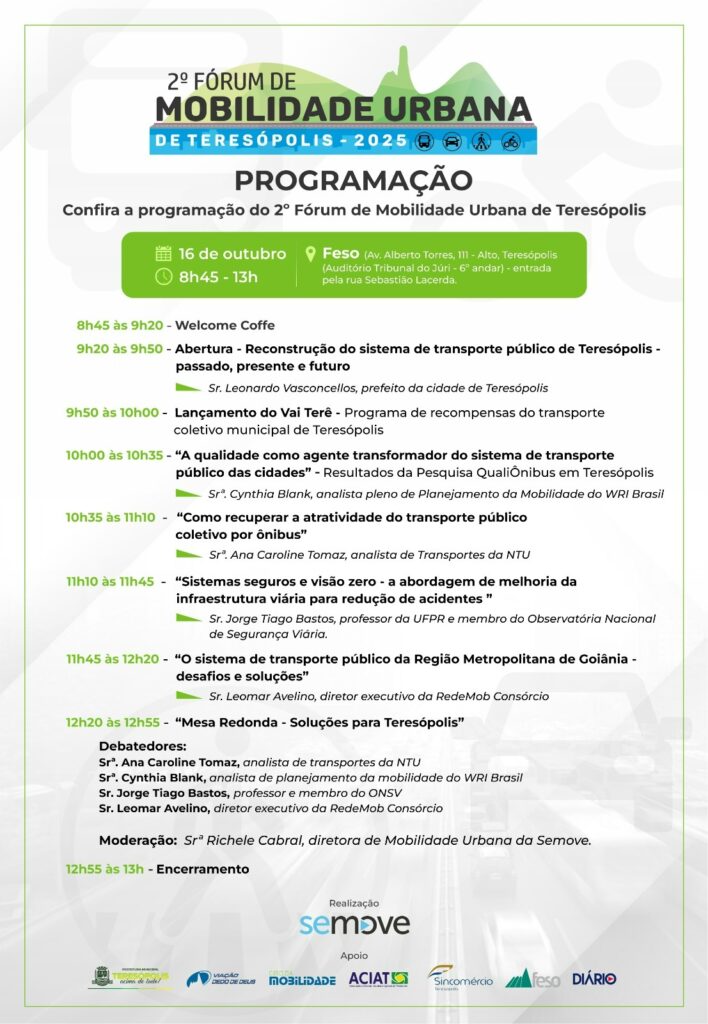 O encontro terá ainda uma mesa-redonda sobre os caminhos para qualificar o transporte público de Teresópolis, mediada pela diretora de Mobilidade Urbana da Semove, Richele Cabral, reunindo todos os palestrantes.