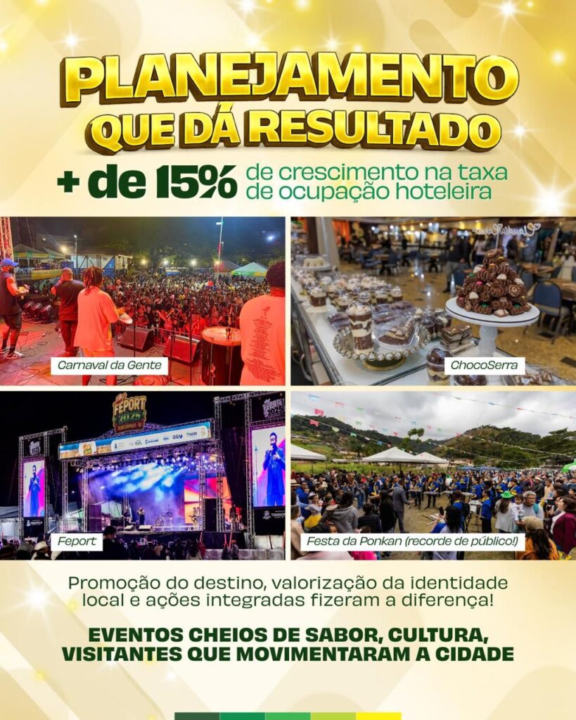 Além das ações de promoção institucional, a realização de eventos promovidos pela Prefeitura e pela Secretaria Municipal de Turismo teve papel fundamental no aquecimento da economia e na movimentação da rede hoteleira ao longo do ano. Iniciativas como o Carnaval da Gente, a ChocoSerra, a Feira do Produtor Rural de Teresópolis (Feport) e a Festa da Ponkan, que registrou recorde de público, atraíram milhares de visitantes ao município, ampliando o fluxo turístico e impactando diretamente a taxa de ocupação dos meios de hospedagem.